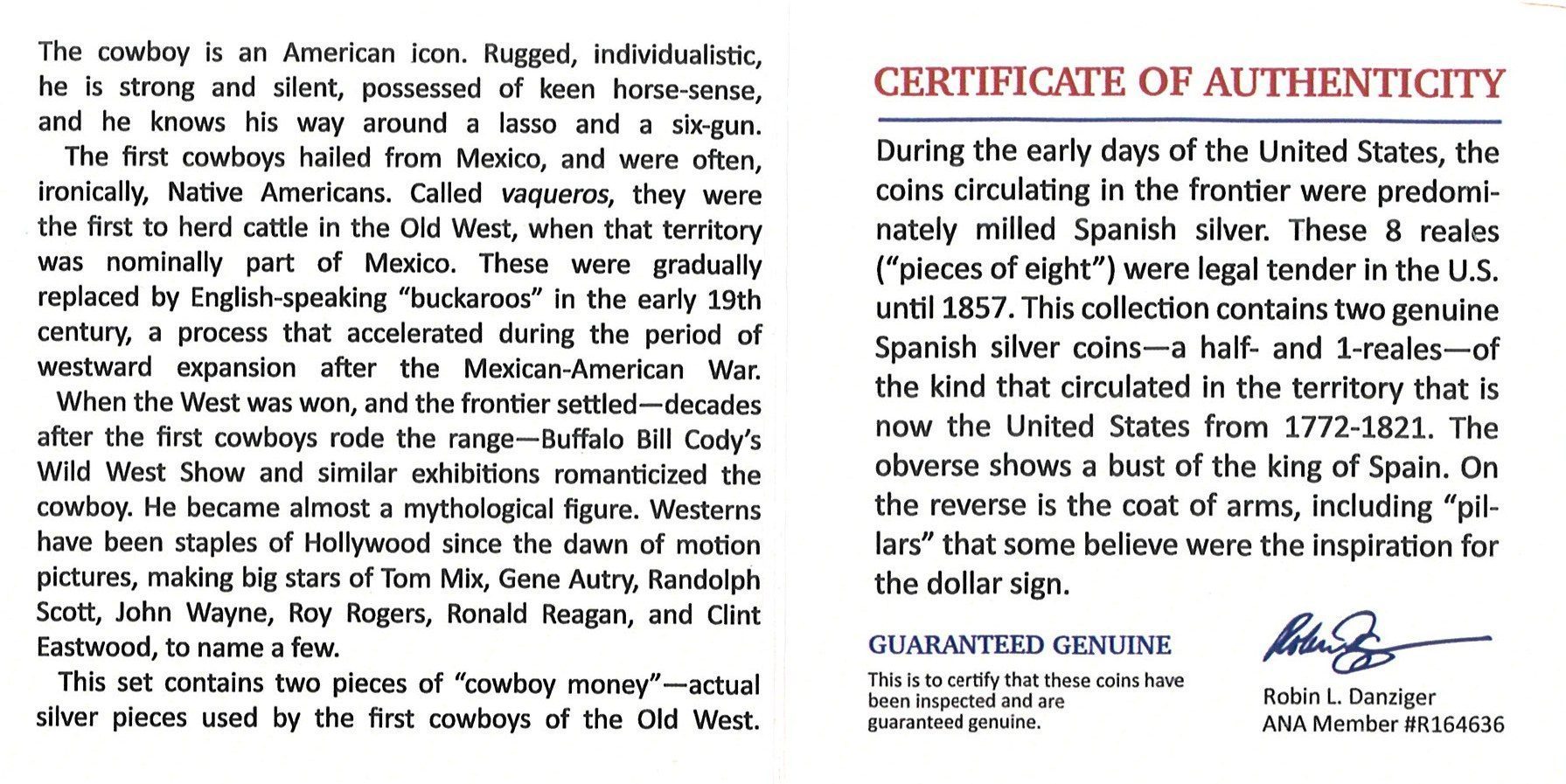 This set contains two pieces of “cowboy money,” silver pieces used by the first cowboys of the American Old West.